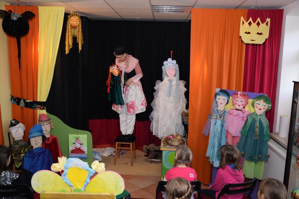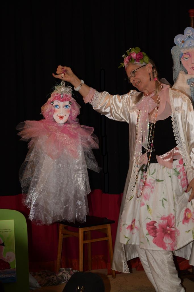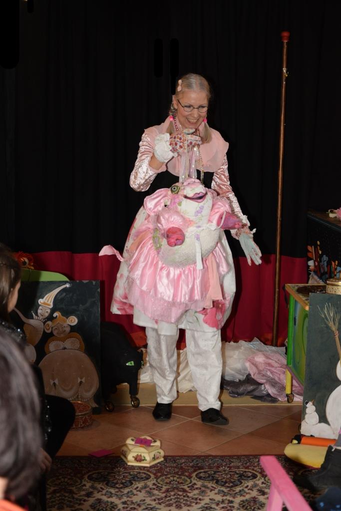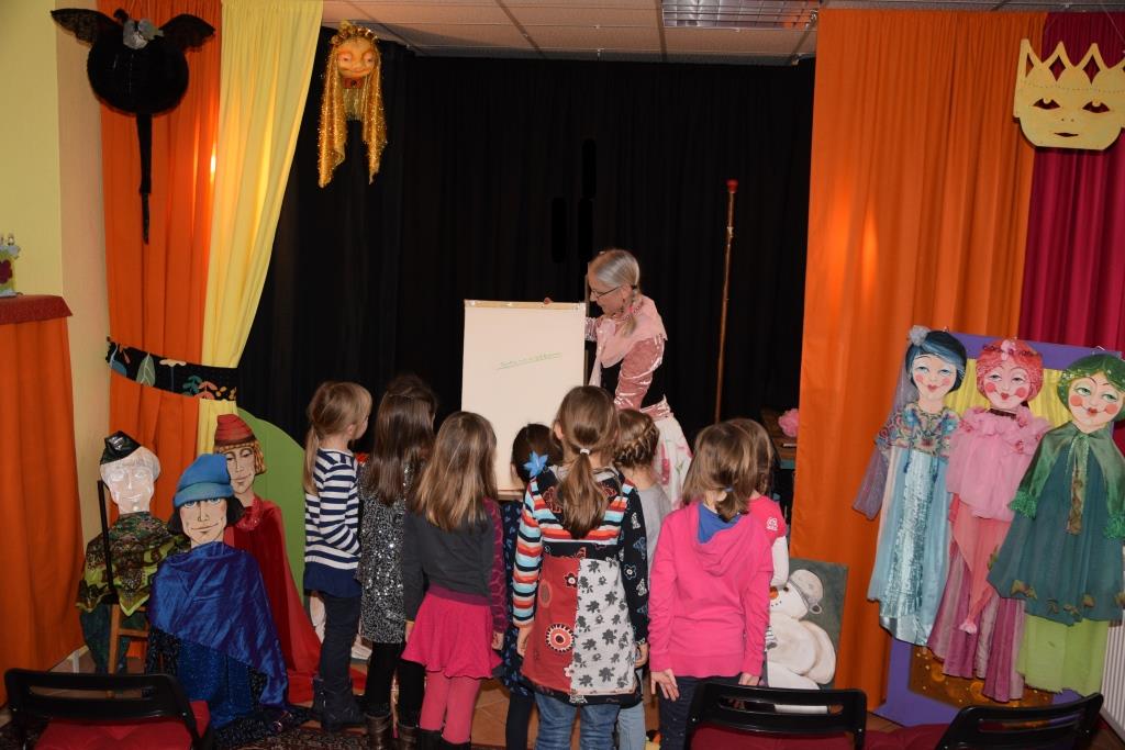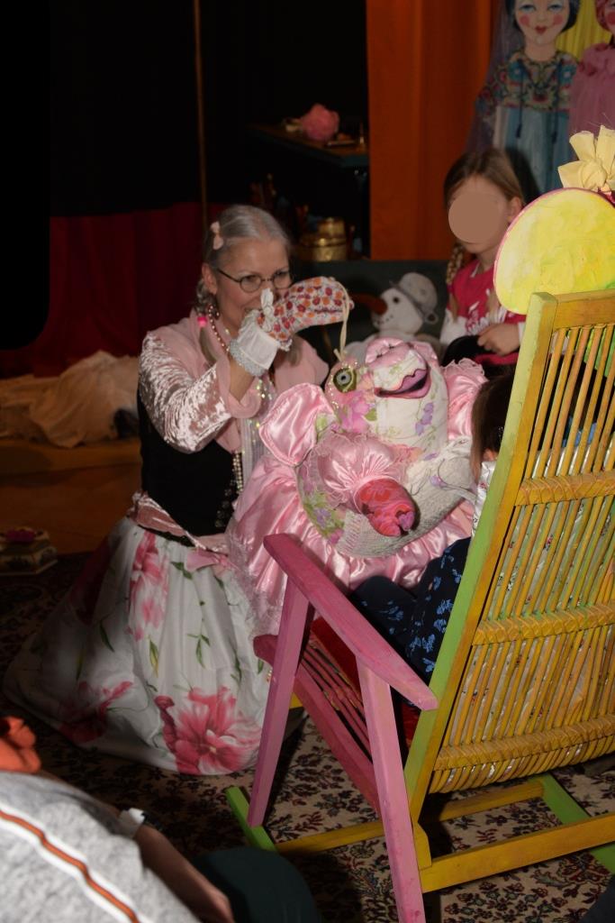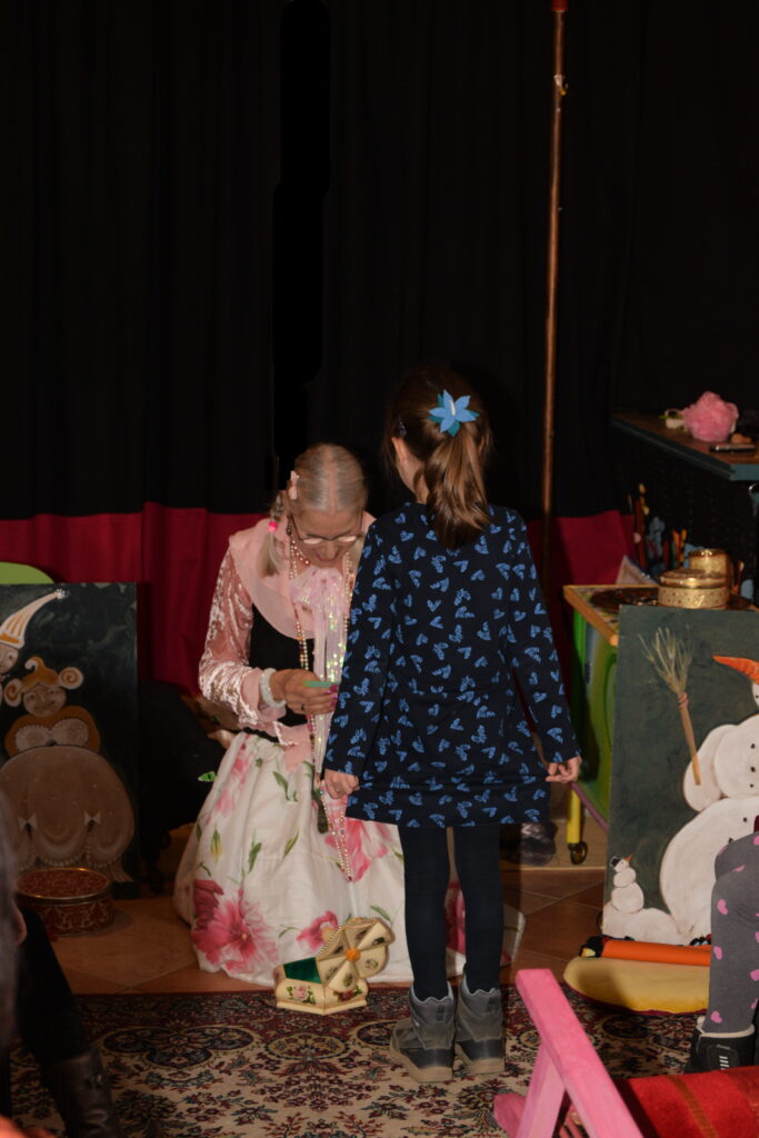 Die Gäste erleben eine kurzweilige wunderschöne bunte Zeit in meinem kunstvollen Phantasiereich. Sie können sich in dem kreativem Ambiente umschauen und alles bestaunen, was an den Wänden hängt. So werden sie kunstvoll eingestimmt und neugierig gemacht auf das, was sie erwartet. Das Geburtstagskind wird gebührend empfangen, erhält Gratulationen von meinem bunten Vogel und darf im Geburtstagsschaukelstuhl Platz nehmen. Wenn die Glocke erklingt beginnt das Erzähltheater. Ich erzähle und spiele mein Programm mit Figuren, Bildern und Requisiten. Am Ende dürfen die Kinder noch einige Figuren von nahem betrachten.